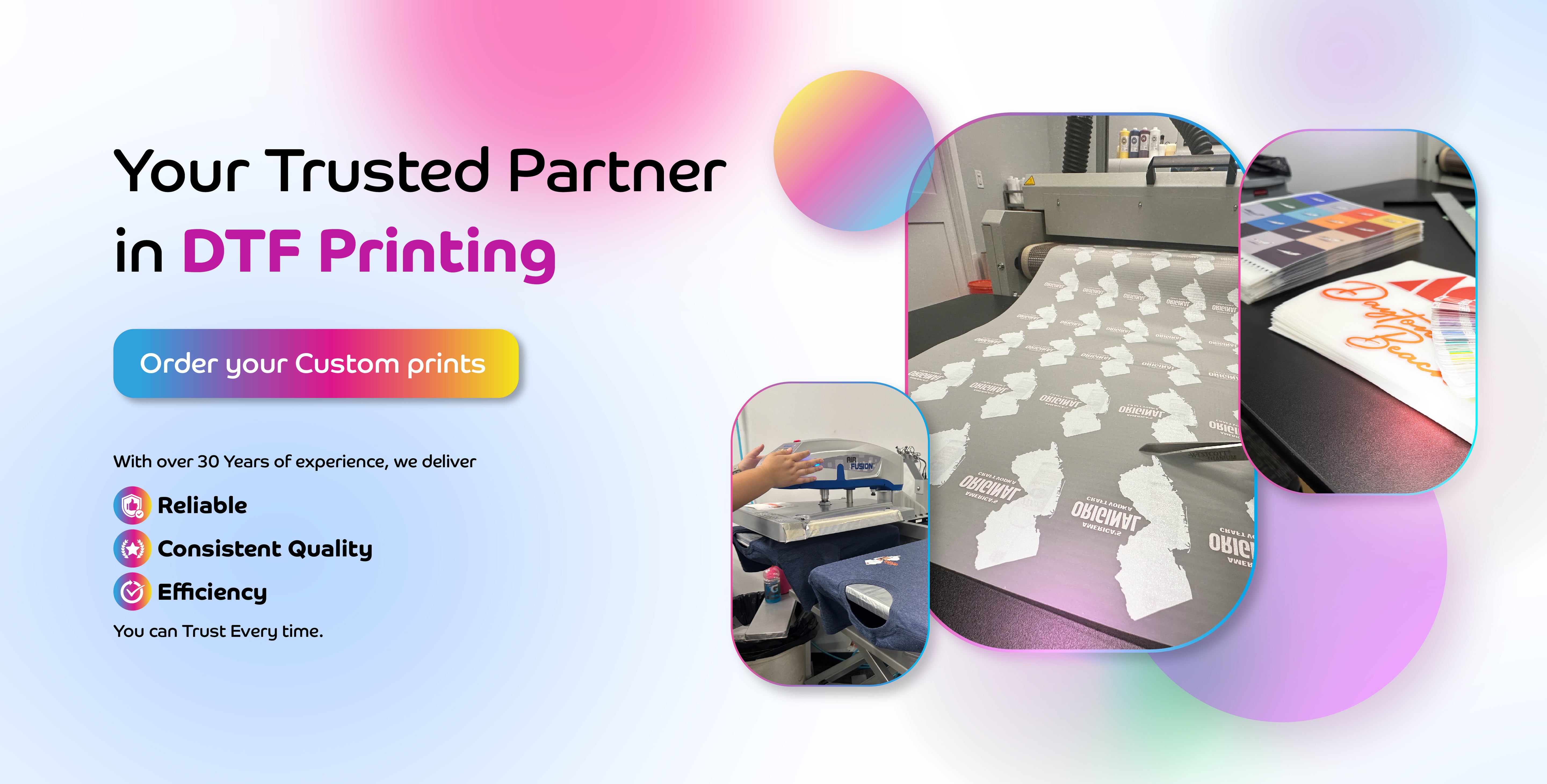 Applying DTF transfers is now simpler than ever. Our transfers ensure seamless pressing with minimal effort, delivering vibrant, long-lasting prints every time. Fast, efficient, and designed for flawless results.